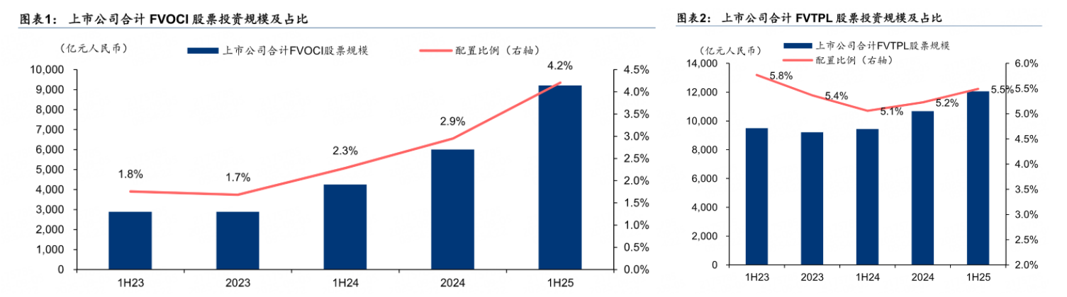 据统计2025年上半年,7家上市保障公司显耀加多了高息股的建立。其中,计入“FVOCI”(以公允价值计量且其变动计入其他玄虚收益)类别的股票平均建立比例较岁首擢升1.3个百分点,达到4.2%,增配限制约0.32万亿元。同期,计入“FVTPL”(以公允价值计量且其变动计入当期损益)的股票建立比例也出现小幅上升。