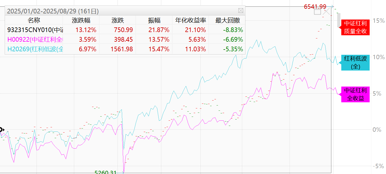 从干系红利指数瓦解来看,当今阛阓主流包括中证红利指数、红利低波指数、红利质料指数等,尽管齐指向高股息钞票,但底层钞票散播和瓦解存所不同。截止8月底,中证红利质料全收益指数年内涨13.12%,同期中证红利全收益指数、红利低波全收益指数涨3.59%、6.97%。
