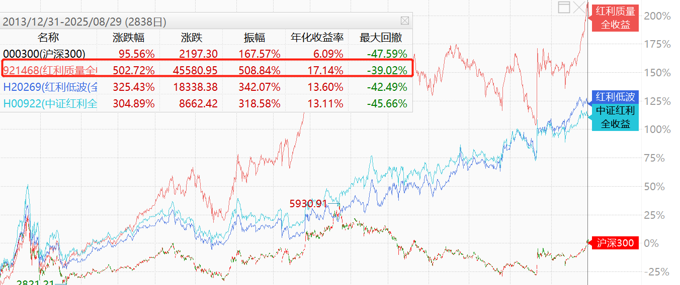 与传统高股息政策不同,中证全指红利质料指数罗致特有的“红利+质料”双因子筛选机制,聚焦既具备低估值特征、又领有高质料基本面的优质企业。截止2025年8月29日,该指数的全收益版块自基期以来累计涨幅达502.27%,显耀高于同期红利低波全收益指数(325.43%)和中证红利全收益指数(304.89%)的瓦解。