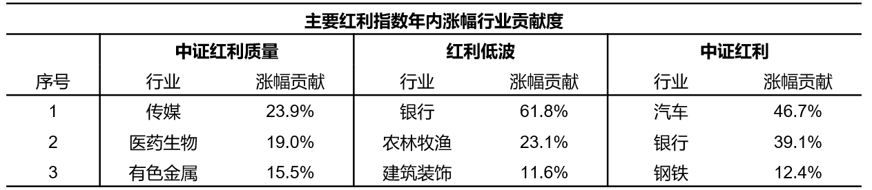 解构收益起首,据Wind数据自满,本年银行股在传统红利指数中占据了饱胀主导地位,孝敬了红利低波指数62%的涨幅及中证红利指数近40%的涨幅。中证红利质料指数的收益结构更多元,其年内涨幅主要收成于传媒、医药生物等成长板块的驱动。