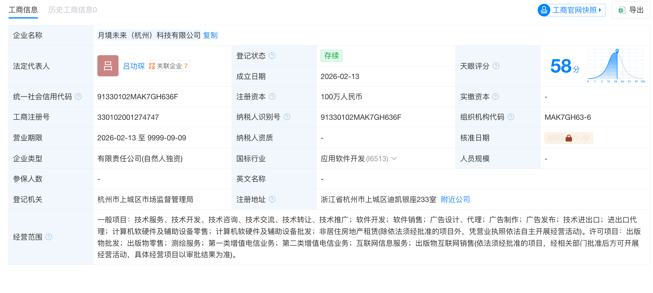 天眼查自大,月境昔日 (杭州) 科技有限公司,确立于2026年,位于浙江省杭州市,是一家以从事软件和信息时期作事业为主的企业。企业注册成本100万东说念主民币。吕功琛为该公法令东说念主、实质章程东说念主。