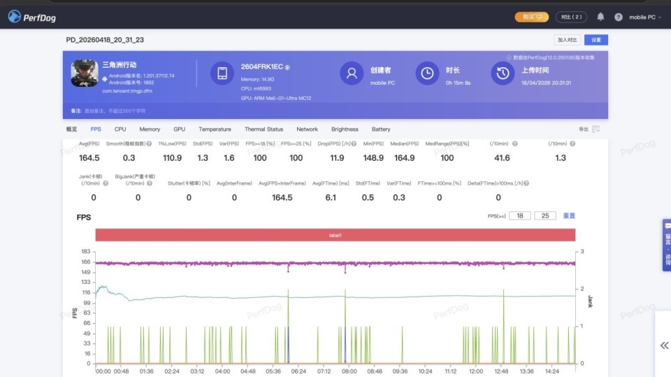 《三角洲活动》,诞生为高清画质+165帧上限,平均164.5帧,1%Low帧为110.9;
