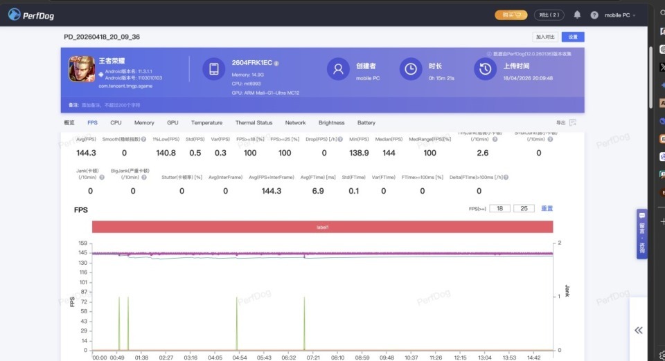 《王者荣耀》,极致帧率,超高辞别率,平均144.3帧,平均CPU使用率仅为20.3;